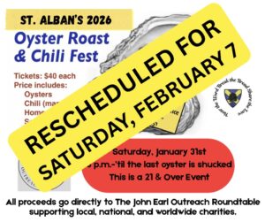 Due to the forecast for several inches of snow this weekend, I am cancelling both worship services this Sunday, Feb. 1 – the morning service and our planned Choral Evensong. The weather should be better next weekend and we will have our Oyster Roast on Saturday evening the 7th and worship as usual that weekend. If you know of any one who would like to support our outreach ministries by buying a ticket to the Oyster Roast, contact the church office this week and we will save a ticket that can be paid for at the door that evening.